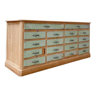 Furniture by trade, oak seed maker. Fully stripped. Red plinth eiffel tower. 12 drawers and 2 retractable shelves. Sun of a drawer: larg 44/ht 17/ prof 43.5. The back of the furniture is perfect and can stay in sight.