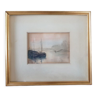 French school of the 20th century. Ink on paper. Signed at the top right. "the boat in a port, with the elegant ladies on a stroll" In a frame. Visible dimensions 29 X 24 cm. Total dimensions 45 X 40 cm. Slight wear on the edges of the frame.