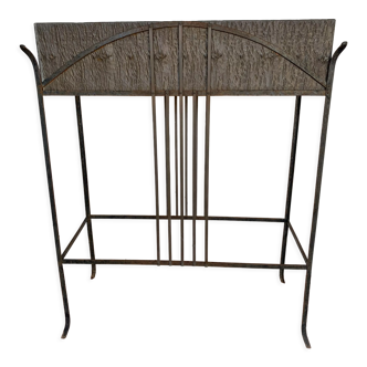 Planter on metal legs and perforated sheet metal, in the style of Mathieu Mategot. 50s. Total height: 66 cm. Width: 45, 5 cm. Depth: 17 cm. In its juice. The painting is to be reviewed. Surface oxide. The sheet has no tears. Strong and stable.