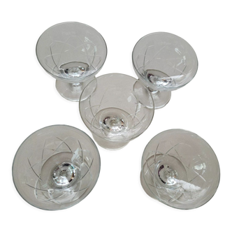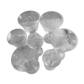 4 champagne flutes. Dimensions: height 12 cm X 5 cm. -5 aperitif, digestive, wine glasses, or possibly verrines. -dimensions: height 6.5 cm X 5 cm. -details: cut in crosses. Style: elegant and sober, the size does not hinder the visual of the guests.