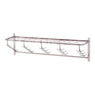 A streamlined coat rack from the 1950s with elegant details. Designed in the style of Mategot or Pilastro, characteristic of perforated metal. The wall-mounted coat rack is suspended from two inclined matte black plates that also form the back panel. The frame is made of organically shaped chrome tubing, with six original coat hooks on the lower bar. At the top, a compartment with a textured pattern provides space for hats, etc. The coat rack has been cleaned and treated with professional metal wax, making it immediately usable.