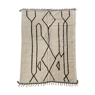 This beautiful hand-woven Moroccan wool rug features a minimalist geometric design that blends tradition and modernity. Measuring 180x270 cm, it features three distinct patterns stacked vertically: a hexagon, a square, and a rectangle, each accented by black lines on a soft beige background. This subtle and elegant contrast makes it an ideal piece to enhance any interior, whether modern, bohemian or Scandinavian. Made using traditional Berber artisanal techniques, this wool rug offers a pleasant and durable texture. The fringes at the ends add a touch of authenticity and craftsmanship, perfect for those looking to combine simplicity and elegance in their interior design. Material: 100% wool, hand-woven for a soft texture and excellent durability. Dimensions: Length: 270 cm. Width: 180 cm. Features: Minimalist geometric pattern inspired by Berber traditions. Neutral and natural colors that easily integrate into any type of decoration. Fringed finishes for an authentic artisan touch. Ideal for a living room, bedroom or other living space. Care: Vacuum regularly on low power. If stains occur, clean with a damp cloth and mild detergent. For a deeper clean, it is recommended to call a professional. Condition: New.