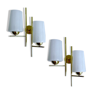 Two very nice wall lights. Mid-century modern. Black metal base. Opaline glass shades. Rosewood and brass details. Italian 1950s. Small bulbs needed.
