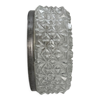 Vintage Industrial circle wall or ceiling lamp made in former Czechoslovakia during the 1970s. Was used in factory offices and corridors. It features a metal back and an embossed milk glass cover. The socket requires standard E27/ E26 light bulbs. The weight of the light is 1 kg.