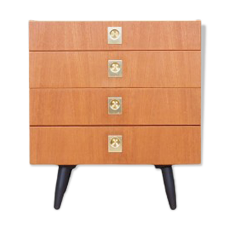 The chest of drawers was made in the 1970s, danish production. The structure is covered with teak veneer. The legs are made of solid wood, stained black. Metal handles. Surface after refreshing. The dresser is a classic drawer unit ideal for any space. Thanks to its four capacious drawers, it will perfectly fulfil its role as a cabinet for documents or toys in the children's room or as a linen wardrobe in the bedroom. Condition: the surface of the chest of drawers has been refreshed. Minor scratches and marks are visible. Larger signs of use are always shown in the photos. Product ready to use. *for safety reasons, the furniture may have its legs unscrewed for transport. Assembly should not be a problem. If you have any doubts, please contact us and we will send you an instructional video. Technical data. Height: 65 cm. Width: 59, 5 cm. Depth: 48, 5 cm.