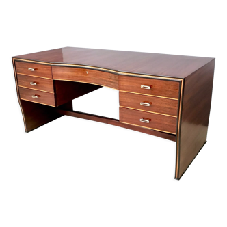Small art deco desk in mahogany veneer from the 1940s/1950s in very good overall condition. The piece of furniture has been recently French-varnished, so it may show small signs of use. There are some signs of age-related blackening on the drawer handles, the interior bar, and the base of the piece of furniture. It has 3 drawers. 2 interior drawers 50x43 cm h: 8cm. 1 interior drawer: 54x50 cm h 8 cm.