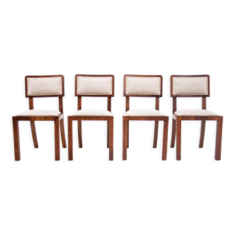 Set of four dining chairs produced by TON in the Czech Republic during the 1990s, based on the iconic Thonet No. 811 design attributed to Josef Hoffmann. The chairs feature a classic bentwood structure with elegantly curved lines, reflecting Thonet's long tradition of craftsmanship. The seats and backs are made from woven plastic strands, visually resembling traditional rattan while offering increased durability and resistance. The combination of lightweight construction, ergonomic shape, and timeless design makes these chairs suitable for both residential interiors and commercial spaces. Dimensions. Height: 79 cm (31.1 in) Seat height: 46 cm (18.1 in) Width: 45 cm (17.7 in) Depth: 54 cm (21.3 in) 260123.