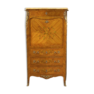 Louis XV style curved secretary with a drop-down front and four drawers in rosewood marquetry decorated with flowers. Ornaments and handles in gilded bronze. Moulded marble top. Circa 1950. Interior with veneer featuring five small drawers, a niche, and a shelf upholstered in burgundy leather with a gold trim. Includes a key. Lock is non-functional. The shelf requires adjustment to close properly. Width 82 cm, depth 40 cm, height 153 cm, shelf 55x45 cm.