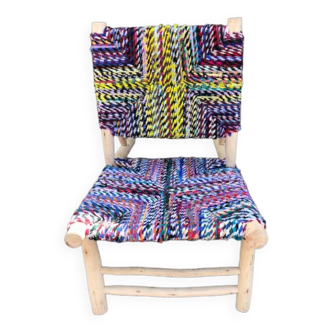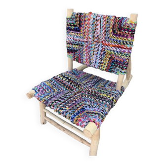 Small wooden chair made entirely by hand in morocco. The seat and backrest are made of wicker surrounded by long strips of recycled fabrics. The men cut the laurel wood, assemble it and weave the seat and backrest. Each model is unique. Dimensions: they may vary slightly. Total height: 63 cm. Seat height: 31 cm. Depth: 29 cm. Width: 31 cm.