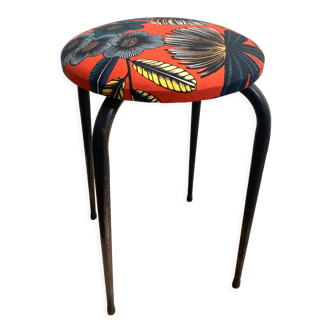 Stackable stool from the 70s. Upcycled model, wooden seat covered with olive-coloured faux sheepskin fabric, renovated metal legs painted in lilac. Unit price displayed.