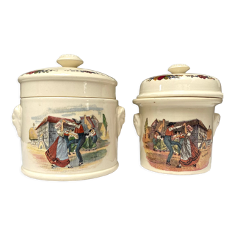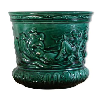 Two beautiful 19th century slip planters, decorated with putti and angels with musical instruments. The interior of the planters is light green. They are signed in hollow ts (thomas sergent). Thomas-victor sergent is a ceramic artist born in 1830 and died in 1890. He is part of the historicism movement and brings the achievements of the french renaissance up to date, in particular paying homage to bernard palissy, through his work. His works have been sold at public auction 49 times. Rich relief decoration. Perfect for putting a small plant or simply as a decorative object on a piece of furniture. In perfect condition without any accidents. Minimal traces of use. Height: 17 cm diameter: 15.5 cm diameter at the foot: 11 cm interior height: 12 cm interior diameter: 14 cm weight: 1.7 kg both fast and careful shipping.