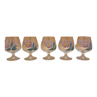 Set of 6 vintage juice glasses decorated with flowers. Their small base (the bottom) and their slightly flared shape give them originality, their flowers, a nice spring note! Very good condition.