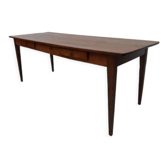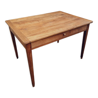The wood of this table or desk was completely stripped and sanded, and left raw. 2 drawers of good capacity equipped with metal shell handles. Some imperfections: stains on the tray, damaged right front foot... (see the latest photos).these do not stain the solidity and charm of this "old lady"... Height under drawers 61 cm. Weight 20 kg.