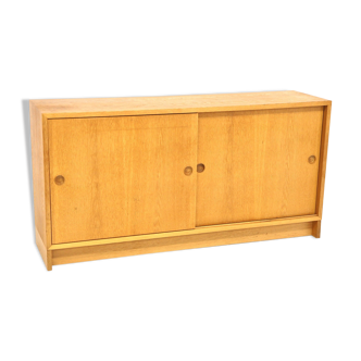 Double sliding door sideboard made in the 60s/70s, Danish production. Light oak veneer, meticulous finish: beautiful handles, mitre joint assembly, choice of veneer, the interior space is divided by adjustable shelves on each side. Minimal and efficient, this sideboard is part of a modular system. In good condition. Dimensions: h 70 cm x w 120 cm x d 40 cm. Removable base forming a plinth: d 36 cm x h 10 cm x w 120 cm. Characteristic of Scandinavian design in the style of Børge Mogensen. This piece is part of a light oak wall unit consisting of 8 elements, including 2 small cabinets, a chest of drawers with 5 drawers, 3 bookshelves measuring 60 x 60 x 30 cm, and 1 bookshelf measuring 120 cm. Stackable and composable at will.