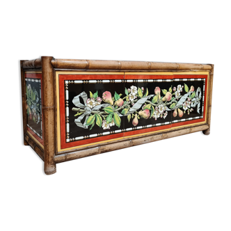 Lacquered wooden box with pearly flower patterns. The lid is slightly curved in shape. Some scratches and gaps: see photos. Size: 20 cm long and 10.5 cm wide. Feel free to look at all my listings. Very neat shipping with bubble wrap. For shipments outside the france, contact me for the rate.