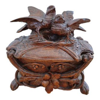 Old cigar cellar. Black forest. 19th century wooden box. Note! Many accidents: Birds' wings. Support sticks of the boards inside the right side (left side ok) Absences of the feet or support under the box. Presence of key (works) Sold as it is, see photos. Total size of the box: Length 26.5 cm, width 20 cm, total height 24 cm. Don't hesitate to contact me for any information, Thank you.
