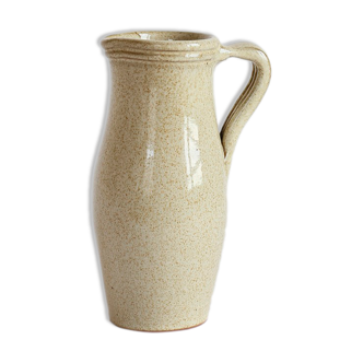 The pitcher is in very good condition, no accidents, no cracks. Note only a very small jump of enamel quite superficial at the bottom, near the stop with the ass of the room, of about five millimeters. It is a delicate potter's piece, turned and then enamelled, with a beautiful beige enamel slightly cloudy, vibrating with barely speckled shades. Pretty slender shape, high and not very ventrue, with a thin handle. The pitcher is signed on the reverse at the tip and the stamp in hollow jean dubost, potter in noron, in lower normandy. Beautiful regional work french of the late 60s.