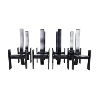 The Golem chair, with a high backrest in lacquered wood, was designed by Vico Magistretti as an homage to the Scottish architect Charles Rennie Mackintosh, inspired by an exhibition on his work. The backrest is slightly shaped to provide comfort while seated. This design is a rare case where Magistretti’s reference to the past does not arise from the recovery of anonymous models or historical types. Produced in the 1960s by Poggi in Italy, these chairs are crafted from wood and exhibit a vintage style. They are in very good condition, with wear consistent with age and use. Please note that items made of rosewood are subject to a special export process which may extend delivery time by 2 to 4 weeks.