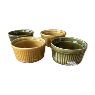 Set of 4 emile henry ramekins. Identical models. Only the exterior color is different: 2 blue and 2 orange brown. Perfect condition. Ribbed exterior. Signs of use for the 2 brown ramekins below but they are not damaged (see photos) Diameter 9 cm. Height 4.6 cm.
