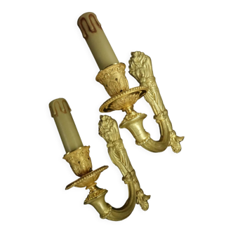 Pair of vintage wall candlesticks in gilded brass, very good condition. Height 33cm. Width 7.3cm. Candle diameter 2.5cm.