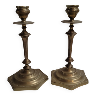 Old pair of candlesticks dating from the end of the Second Empire. Bobeches and feet in brass, metal on the central shaft with beads and marble feet. Patina of time on the whole. Two very beautiful pieces from the Napoléon III era with classic and elegant charm.