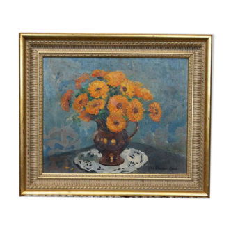 Oil on canvas signed framed, representing a bouquet of yellow flowers dimensions 65x41cm.