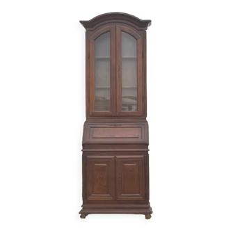 I am selling this antique piece of furniture which is about 100 years old. It is made of walnut. It is in two parts: the upper part is glazed with two shelves. Width 90 cm, depth with cornice 28 cm without the cornice z3 cm. It cannot be removed. The lower part has two doors and a shelf plus the part which acts as a secretary. There are two hidden drawers accessible if you open the doors. Depth of the bottom 44 cm. The secretary part has two drawers and a shelf between them.