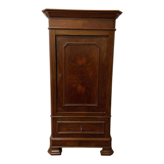 Beautiful english art deco wardrobe in elm magnifying glass 1930/1940. Trace of use, its extendable triangle and its storage with imitation drawer facades. Lock with its key. Nice brass handles.