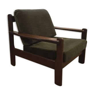 Low fireside armchair, dating from the 70s, solid oak structure, scandinavian-inspired design. Small patina of use on the woodwork, the cushion foams are in good condition, the salmon-colored fabric is very slightly discolored, no wear or tears. The general condition is consistent with the age, this armchair is clean, functional and presentable as is. Fast delivery at an attractive price in paris and the inner suburbs on sunday morning.