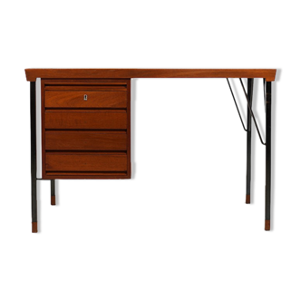 Vintage desk heavy metal structure camel color. The oak top is clearly visible in the photos. The bottom of the furniture is but the wood has played and when the door is opened, we can see at the bottom the separation of the wood. The door and the interior board are not original. Standard size with a cm tray. The wallpaper is new and can be replaced by your care quite easily as needed. In its juice, marked by its experience, massive and of quality. Length 100. Height 75 cm. Depth 45 cm.