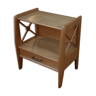 France / 1980 / side table or cabinet / blonde oak / Mid-century A multifunctional side table or small cabinet from the 1980s. This mid-century table has has a compartment for newspapers and magazines on each side and a small drawer under the top. Underneath 2 shelves to provide ample storage space. Constructed from high-quality blonde oak, this side table boasts a natural finish that highlights the wood's beautiful grain patterns. The light hue of the oak brings a warm and inviting feel to your home, complementing both modern and traditional interiors. Its sleek lines and minimalist design embody the essence of mid-century aesthetics, making it a striking centerpiece in any room. Whether used as a side table next to a sofa or a stylish cabinet in your hallway, this piece offers both style and practicality. Its compact size makes it ideal for smaller spaces, while its spacious surface and storage options provide ample room for your essentials. The craftsmanship is evident in every detail, from the smooth finish to the sturdy construction, ensuring it stands the test of time.