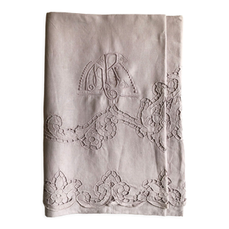 Uperbe linen and silk tablecloth of the early twentieth century, double rf monograms decorated with embroidered florets. Bouquets, flower seedlings, laurel guirelendes and ribbons illustrate the damask of the canvas. Intense and refined iris color handmade in our workshop in limoges, france. Large complexion, machine washable at 40 degrees. Large size to accommodate ten people comfortably. Dimensions: 180 X 260 cm approx.