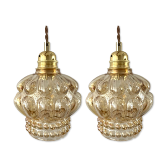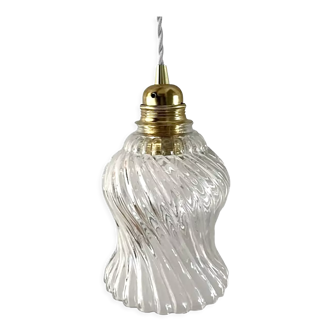 Walking lamp - molded glass - slightly tinted golden - brass socket - screw bulb - ivory twisted textile electric wire 3 meters long - a slight shine at the base (see photos) - lamp to put or hang - charming.