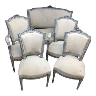Magnificent Louis XVI style living room - 19th century. It consists of six pieces: a bench, an armchair, and four chairs. Very good overall condition, the fabrics need cleaning. Very beautiful details.