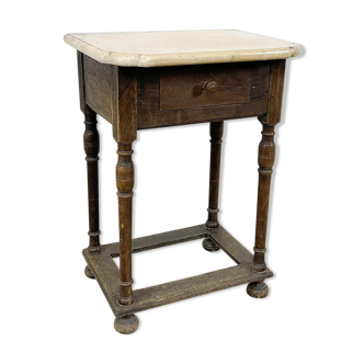 Old side table dating from the 40s approximately. It would be perfect in an entrance, it has two storage drawers and a bordered shelf. Old patina. Stable and robust. Neat packaging.