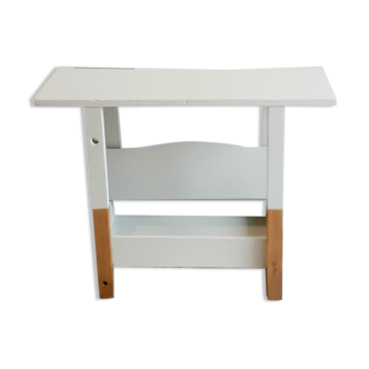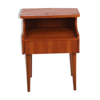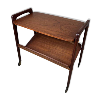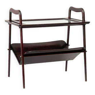 End of sofa magazine holders in wood and brass. Circa: 1960. Two tablets, built-in brass ashtray and storage for magazines. Dark wood. Compass feet. Very good vintage condition. Note: 2 round spots on the top shelf, probably because of wet flower pots. Height: 61 cm / depth: 34 cm / width: 45 cm.