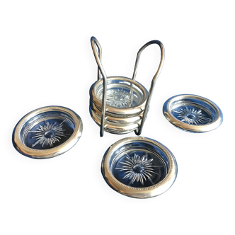 6 coasters and their support in silver metal: diameter 9.5cms, height support 15 cms, traces of use.