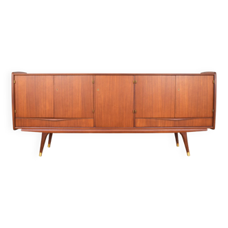 Beautiful sideboard dating from 1958 published by sam (france) for the "demi-siècle" collection dressed in light oak. Beautiful dimensions, it remains light in the lines, raised on 8 long compass feet. Huge storage capacity: behind 4 doors (without key but closing by magnet) hides adjustable shelved spaces and a drawer. Small finishing details give it character and style, original handles, beveled top and bottom cornice, asymmetrical profile, worked side edges. Very good condition, some light shadows on the top stamped, it is completely dismantled if necessary (the instructions are stuck on the back) length: 223 cm height: 100 cm depth: 51 cm side spaces: 56 cm high X 65 cm wide central space: 56 cm high X 82 cm wide adjustable shelf in 8 cm increments.