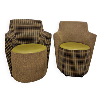 Ameo living room set by walter knoll. Composed of 2 beige leather armchairs and a small side table in black leather and black tinted glass top. Rotating armchairs. Seat height 40cm. Height of the side table 40cm. Perfect for all your waiting, reception or even home spaces.