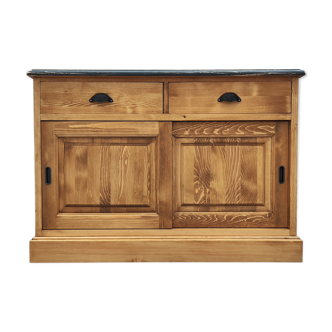 Solid pine sideboard from the 1970s. Two drawers and doors, one shelf. In the style of Rainier Daumiller. Very nice details in the handles. Sideboard is in very good condition with some signs of use consistent with age. Dimensions: Width: 100cm Depth: 50cm Height: 90cm. Sideboard is in very good condition with some signs of use consistent with age. Some signs of use consistent with age.
