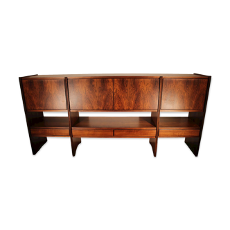 One of a kind! This rare Italian modular wall unit is truly unique and beautifully designed. Crafted from teak and woven webbing. Designer: unknown. The set consists of five elements, two of which have sliding storage units, two with drop-down cabinets, and one beautiful central element with unique drawers. All of this sits on slender legs, giving the unit an airy look and complementing the space beautifully. Finished with a brass top. This wall unit is ideal for storing all your belongings, but also looks stylish as a bar/cocktail cabinet. Considering its age, this unit is in good vintage condition. Do you already have the perfect space for this unique unit Italian beauty!.