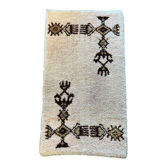 Beautiful Bohemian rug in cream pure wool from the 1970s, a perfect size to place and move according to your decor. A handmade rug as was customary in those years, with a very pleasant thickness underfoot. It could just as easily be hung on a wall. We love our rugs, comfortable and warm, suitable for indoors but also for a terrace or balcony... We are very big fans! In very good condition, the rug has been fully cleaned, and the great advantage is that it can be machine washed, so you can clean it from time to time. Delivered and stored rolled up. Dimensions: L: 110cm - W: 69cm - Thickness: 3cm. The little extra: FREE collection possible in person at PARIS Bastille, France or fast and careful shipping by parcel.