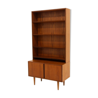 Beautiful vintage Danish bookcase with plenty of storage space. Are you looking for a stylish multifunctional piece of furniture. A piece where you can store items, display your most beautiful belongings, and even use as a bookcase. This design by Johannes Sorth might be exactly what you are looking for. The model is unique in design and execution, made in that typical warm teak veneer, a gem of a piece, unique in versatility. At the bottom, there is a large sliding door cabinet with beautiful handles, above which is a spacious open (book)case with 3 shelves to display your books or your most beautiful items. You can adjust the height of the shelves as desired. Check out the beautiful details such as the elegant handles and slender legs! The piece is in very neat vintage condition, with some age-appropriate signs of use that are hardly noticeable, in our opinion not disturbing and fitting for the age and intended use. There are some slight discolorations / small repairs that are barely noticeable on one side, the cabinet further has a unique character and patina that gives it a beautiful appearance. This model offers a unique overall picture of fine quality at a sharp price. Country of origin: Denmark. Manufacturer: Bornholms mobelfabrik. Designer: Johannes Sorth. Period: 1960s. Height: 182 cm. Width: 101 cm. Depth: 21.5 - 42 cm.