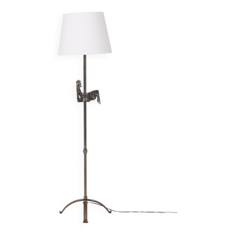 Rare 3 legged forged iron floor lamp. Cleaned, waxed and rewired. The iron has a beautiful patina. Can be sold with or without the shade. Designer: jean touret. Maker: atelier marolles. Origin: france. Period: 1950-1960. Dimensions: H. 142cm. D. 42cm. W. 41cm.