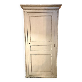 Beautiful old wardrobe, bonnetière (one door), a very light patina on the moldings of the door panels, it closes perfectly with a round wooden handle and a latch that has been added. Inside, two large storage shelves (width: 82.5cm Depth: 45cm) to add one because the racks are present. Clean interior. Large storage capacity. Very stable structure. An old-world charm emanates from this beautiful wardrobe which will be ideal in a beautiful bedroom, bathroom... Note: traces of old woodworms (see photo), the wardrobe was treated several times before being painted.
