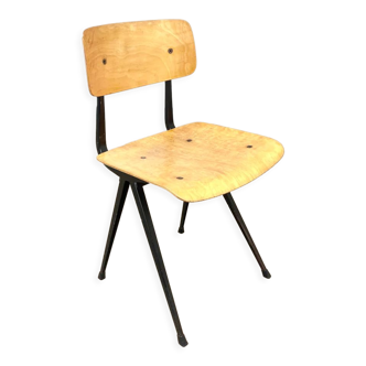 Result Chair by Friso Kramer (1958), a great industrial designer of the 20th century. Structure in white lacquered metal. This is an iconic piece of Dutch design. In an industrial and vintage style, it recalls the work of Jean Prouvé. The Result chair features a fine steel sheet base with an oak seat and backrest, maintaining maximum flexibility, lightness, and strength. Originally created by Friso Kramer and Wim Rietveld while working at Ahrend in the 1950s, the cut steel collection has been relaunched by HAY in collaboration with Ahrend.
