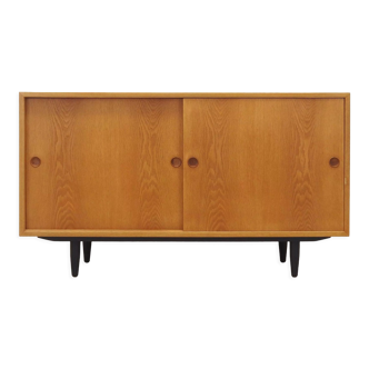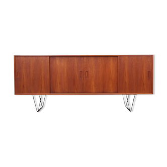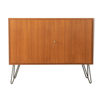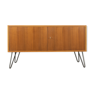 Classic sideboard from the 1950s. Corpus in walnut veneer with three doors, two shelves and new hairpin legs. One door is coated with black formica. Quality features: – very good workmanship. – high-quality materials. – made in germany, manufacturer: wk möbel (branding inside) Condition: Good restored condition with slight signs of usage.