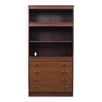 Mid-century Borge Mogensen teak cabinet elements. Chest of drawers and shelf on top. Both pieces are stamped with the maker's stamp and "Made in Denmark." Chest of drawers with four drawers featuring Mogensen's characteristic handles. Shelf with three layers on brass supports. Signs of use and age with scratches, wear, and a small veneer chip at the base. The right side of the shelf has two holes. Please see the attached images. Dimensions: Chest of drawers: W. 100cm, H. 116cm, D. 31.5cm; shelf: W. 100cm, H. 65.5cm, D: 46cm + 1.5cm handles.