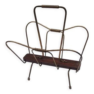 Black lacquered metal magazine rack with brown leather.