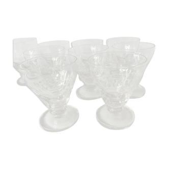Small series of 9 old liquor glasses, mouth-blown. Three frosted glass circles, of decreasing size, adorn them.